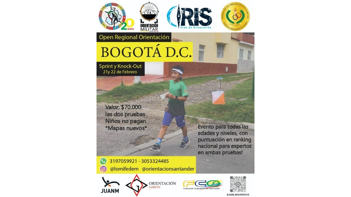 Open Regional BogotáCarreraOrientaciónInscripciones abiertas21 feb 2026 08:00 - 22 feb 2026 14:00America/BogotaBogotáColombiaOrganizado porLOMI - Liga de Orientación MilitarCategoríasH21ED21EDistancias / PruebasK.OSprintInformación del organizador+57 3197059921 - 3053324485